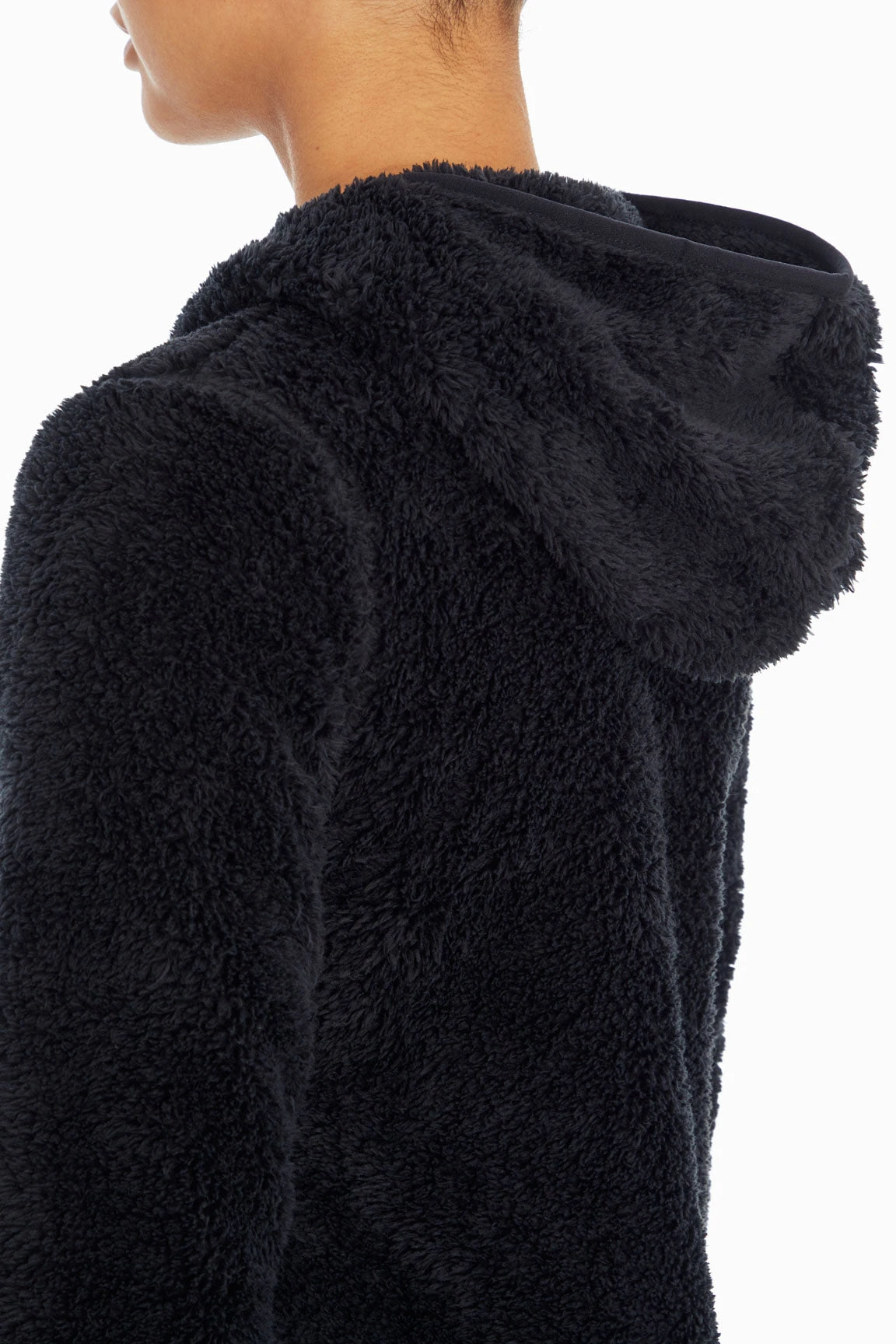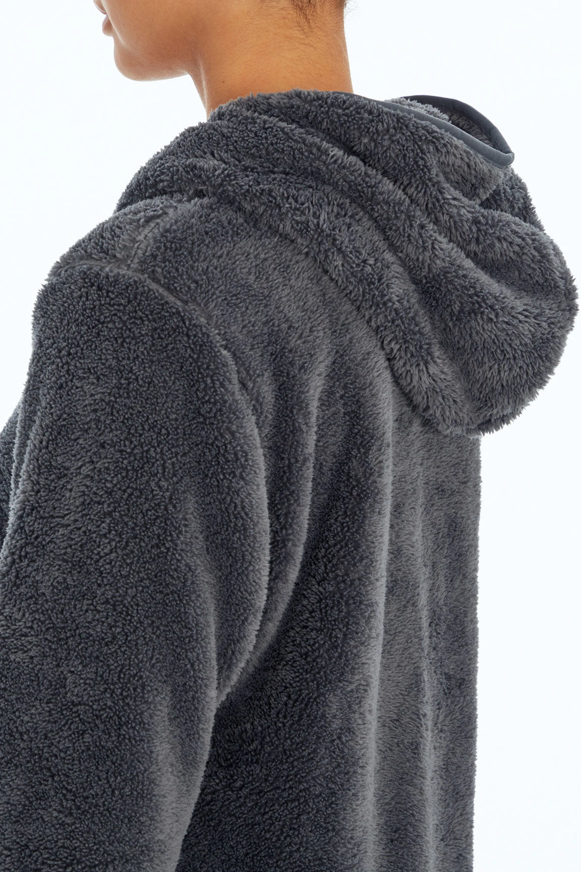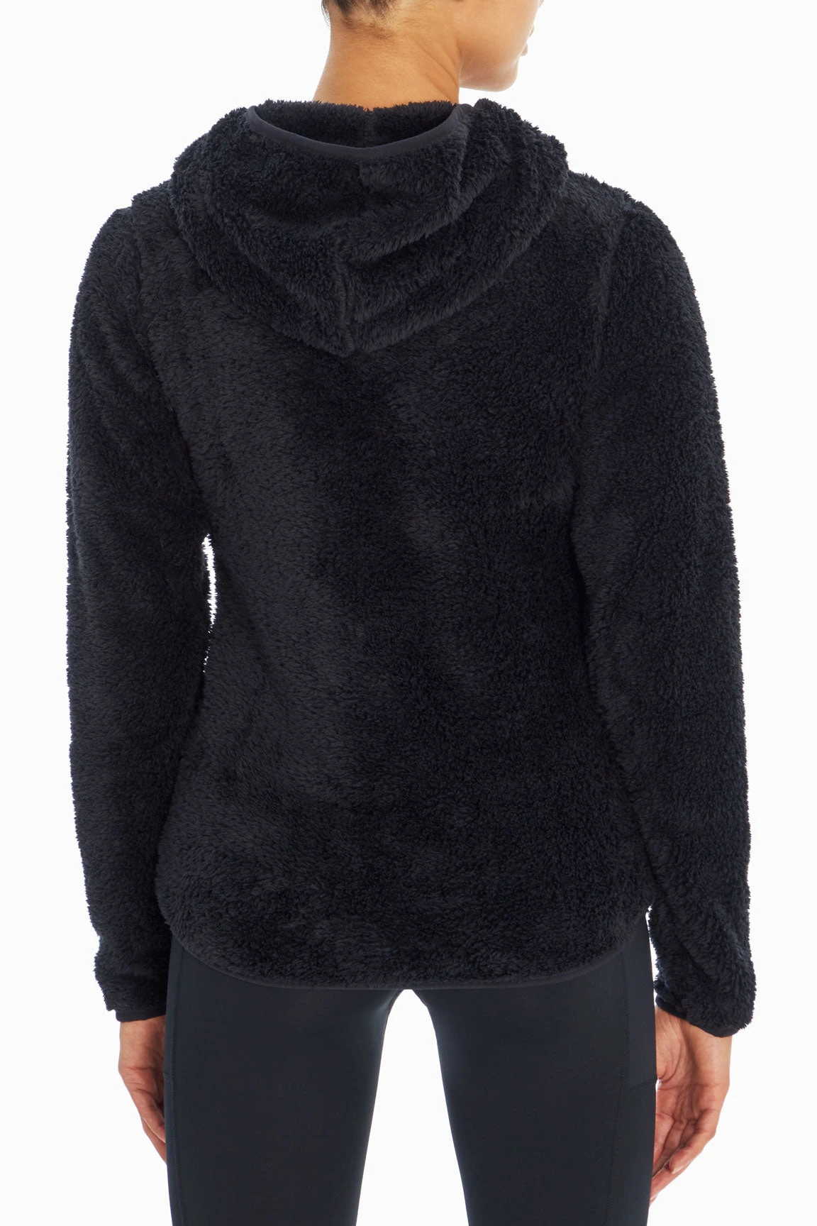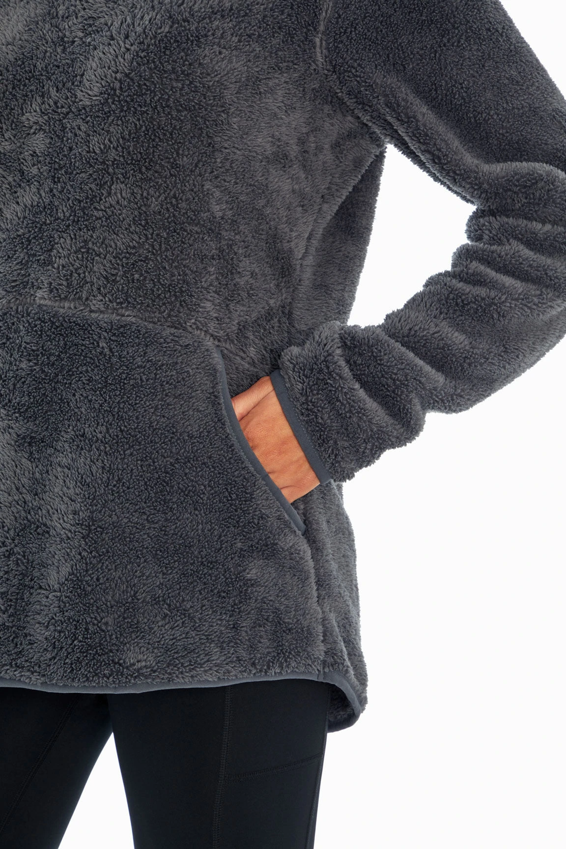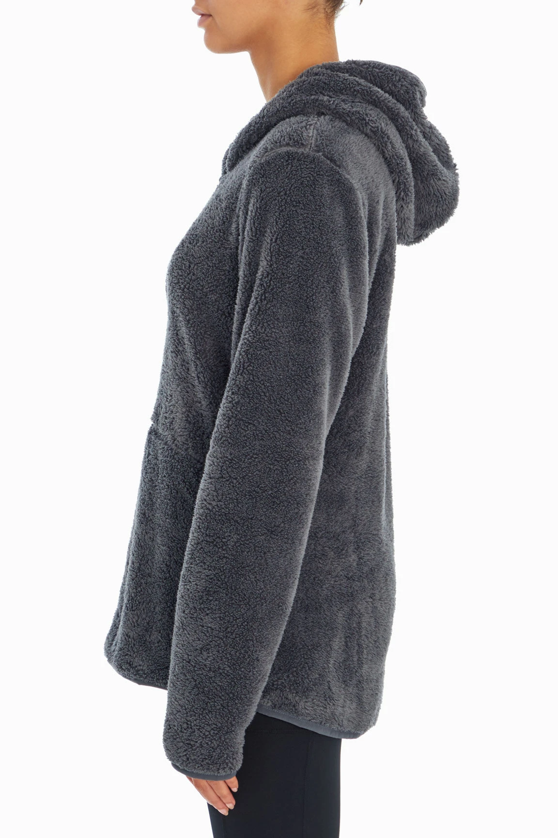 There’s nothing cozier than an active day out in the cooler air with this soft double sherpa hoodie, featuring a hood with surplice detail, piped elastic trim, front kangaroo pocket, and subtle high-low hem.