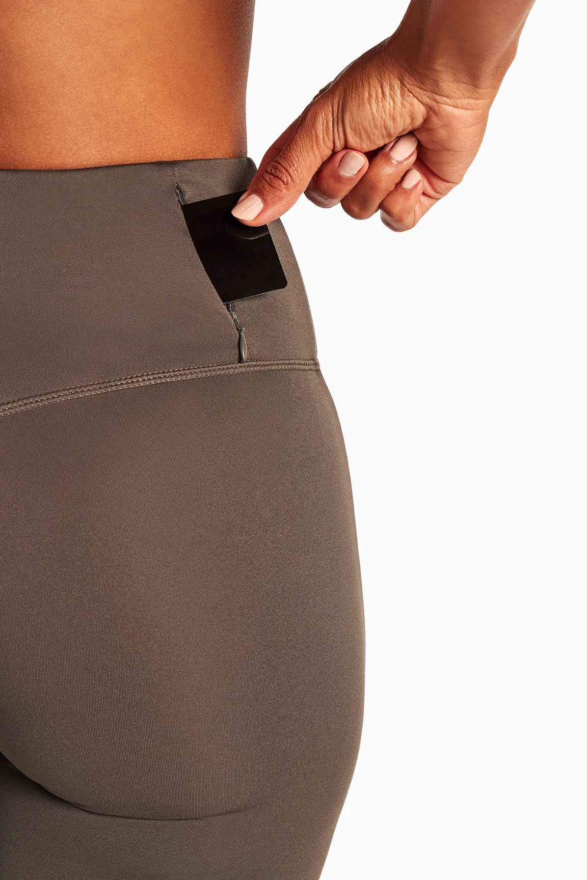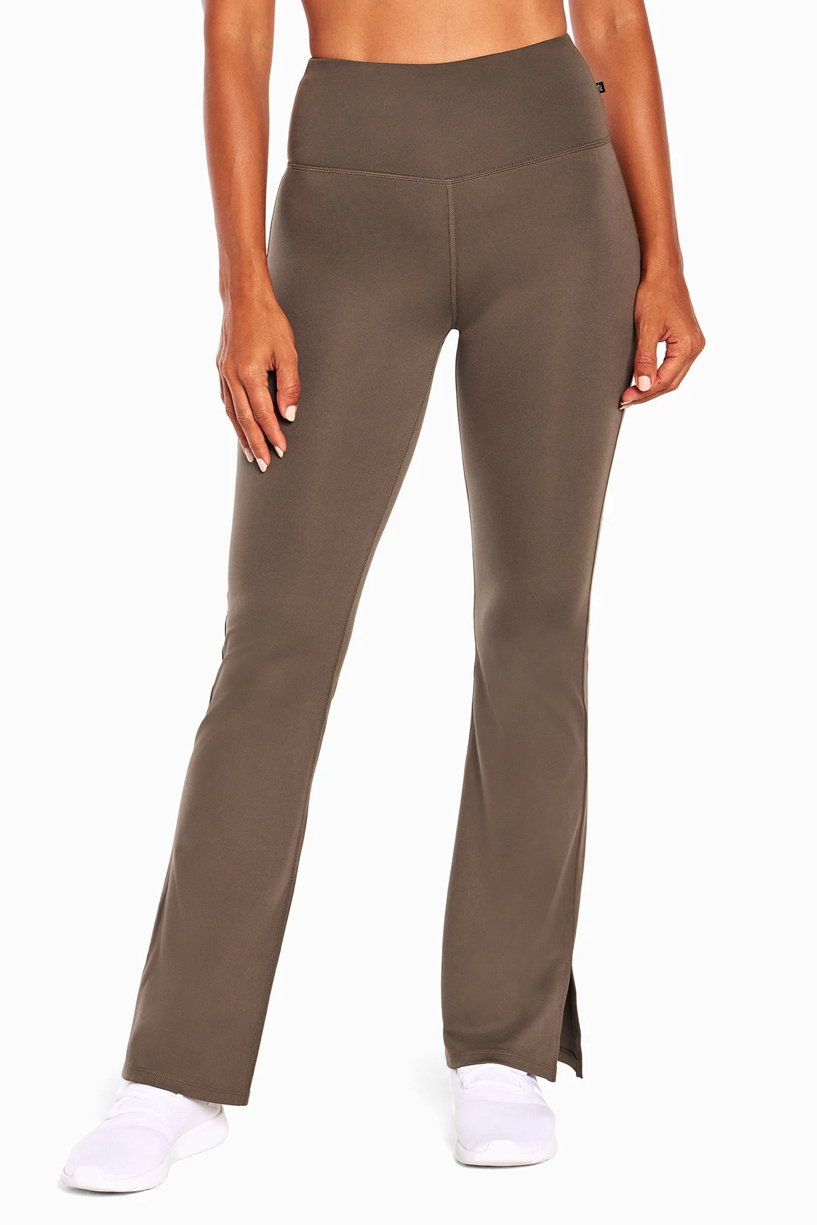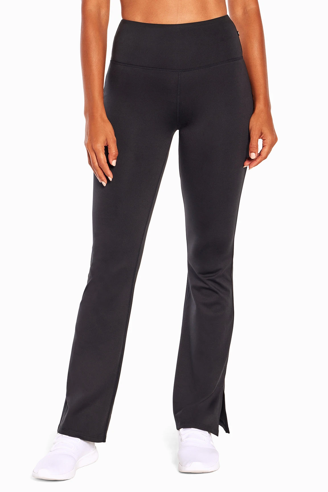 A bootcut fit that flatters any body type, this flared pant is soft-brushed inside and out, with sweat-wicking technology, side slits at the hem, and an elasticized waistband featuring a hidden, secure-zip back pocket.